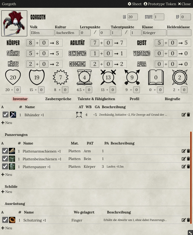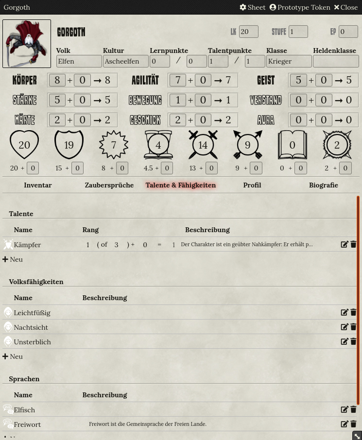 EDIT: Achja, das ganze ist vollständig lokalisiert (bis auf Bugs, hab gerade schon einen entdeckt: Beim Talent Rang steht "of"). Aktuell stehen Übersetzungen für deutsch und englisch zur Verfügung (Die Kompendien sind allerdings nur auf deutsch, weil foundry out of the box keine Möglichkeit bietet, Kompendien zu übersetzen, kann aber theorethisch mit einem Modul (https://foundryvtt.com/packages/babele/) gelöst werden). Wenn jemand Interessse hat, kann er / sie gerne neue Übersetzungen hinzufügen.