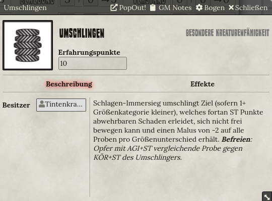 Gestern haben wir außerdem eine neue Version released, die einiges an Automatisierung mitbringt: Man kann jetzt Effekte zu Items hinzufügen, die dann automatisch bestimmte Charakterwerte modifizieren. Damit kann man super die Boni von Items aber auch Talente wie Kämpfer, Einstecker oder Schütze abbilden. Bis jetzt gehen allerdings nur statische Boni, d.h. man kann keine Charakterwerte referezieren (z.B. sowas wie "addiere den Körper-Wert auf Schlagen geht noch nicht).