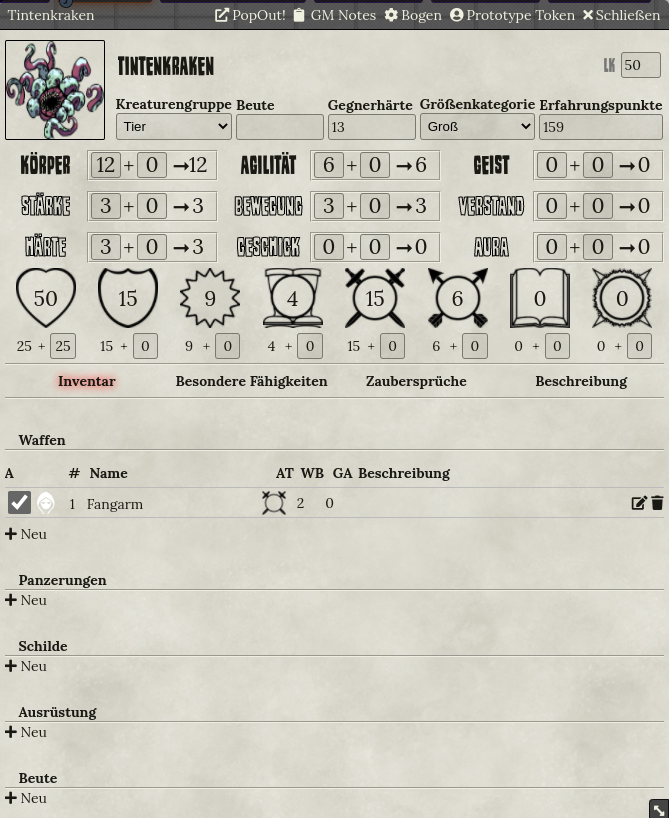 - es ist mir nicht gelungen zu würfeln - aber Sachen zu bewegen, Werte eingeben - Waffen hinzufügen.