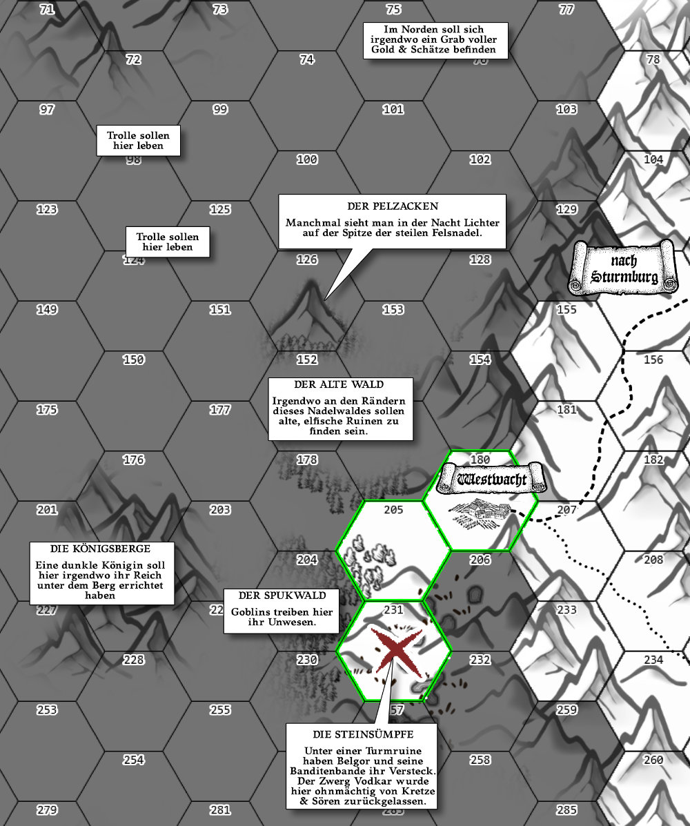 Das Spiel ist eine Mischung aus Hexploration und dem gezielten nachgehen von Gerüchten. In der ersten Session sind 3 Spieler gestartet. sind einem Gerücht nachgegangen und haben dabei 2 Hexfelder entdeckt und auch gleich erforscht. Im zweiten fanden sie dann auch schon die erste Abenteuerlocation. Fing alles ganz ruhig und soft an, doch dann traf man auf den Banditenboss Belgor und es gab durch eine Unvorsichtigkeit des Zwergen Vodkar einen kleinen Alarm. Am Ende flohen der Wikinger Søren Smetterson und der Rattling Kretze aus dem Banditenversteck und ließen den bewußtlosen VOdkar zurück.