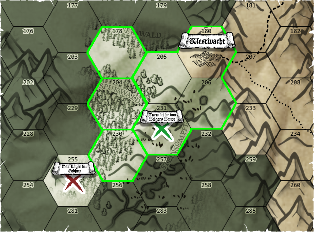 Für Session 2 beschlossen die Schildmaid Berta, der elfische Zauberer Brennduin und der Priester Heilehand am nächsten Morgen den vermissten Zwergen Vodkar zu retten, dessen Spieler auch anwesend war.