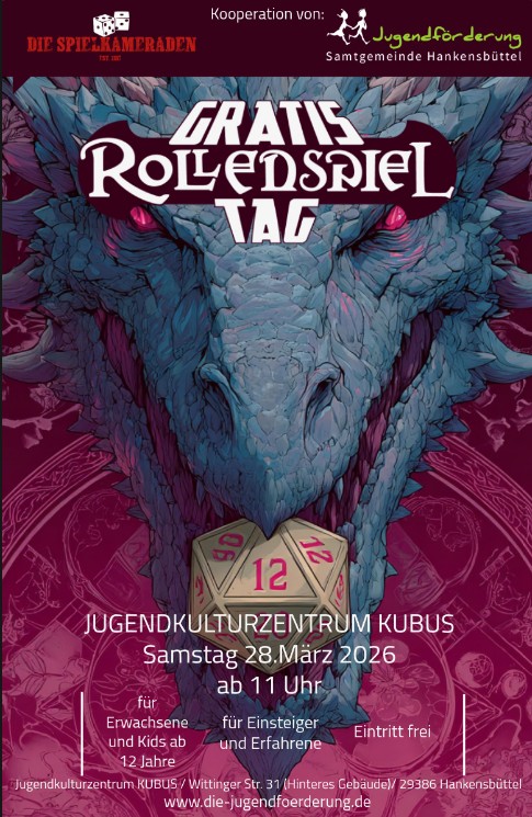 Am 28.03.2026 ab 11:00 Uhr veranstalten Die Spielkameraden gemeinsam mit der Jugendförderung Hankensbüttel im Jugendkulturzentrum KUBUS (Wittinger Str. 31) in 29386 Hankensbüttel den Gratisrollenspieltag (GRT).